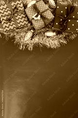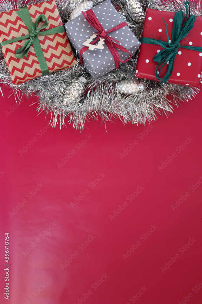 Different Christmas gift boxes with striped glass ball baubles and silver decoration on red background. Christmas festive background