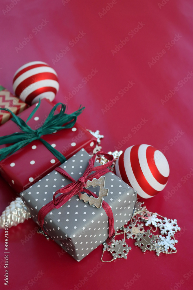 Different Christmas gift boxes with striped glass ball baubles and silver decoration on red background. Christmas festive background