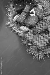 Different Christmas gift boxes with striped glass ball baubles and silver decoration on red background. Christmas festive background