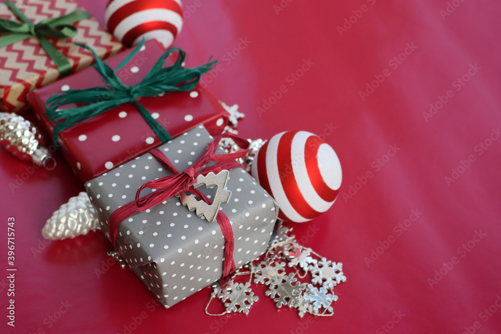 Different Christmas gift boxes with striped glass ball baubles and silver decoration on red background. Christmas festive background