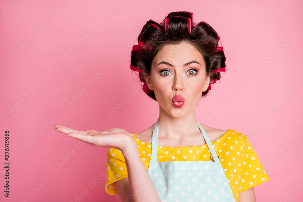 Close-up portrait of her she nice attractive girlish flirty housewife holding on palm copy space pout lips isolated over pink pastel color background