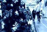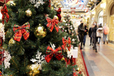 Christmas tree with toys in a shopping mall on festive lights and walking people background. New Year decorations, winter holidays during coronavirus pandemic