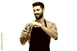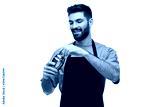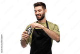 alcohol drinks, people and job concept - happy smiling barman with shaker preparing cocktail over white background
