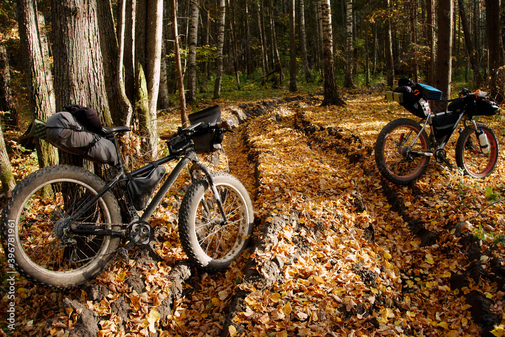 Fatbikes in the autumn forest on the road. Sunny autumn day. Outdoor sport activity. Bikepacking.