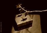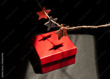 Gift red box with retro craft gift star. Christmas present. Magic concept. Copy space