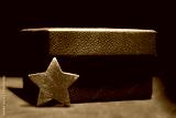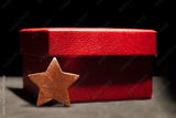 Gift red box with retro craft gift star. Christmas present. Magic concept. Copy space