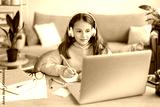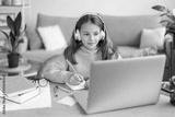 Homeschooling. Smiling girl learning from home while covid-19 pandemic, doing homework, using headphones and laptop for distance learning. Remote school, online education during coronavirus quarantine