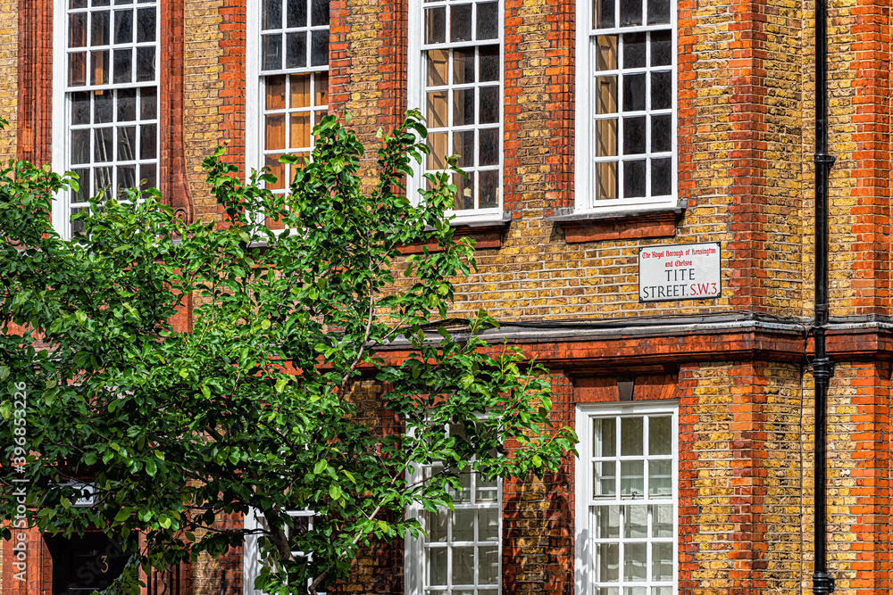 Victorian style red brick terraced architecture apartment flat building in royal borough of Chelsea and Kensington with windows in London, United Kingdom