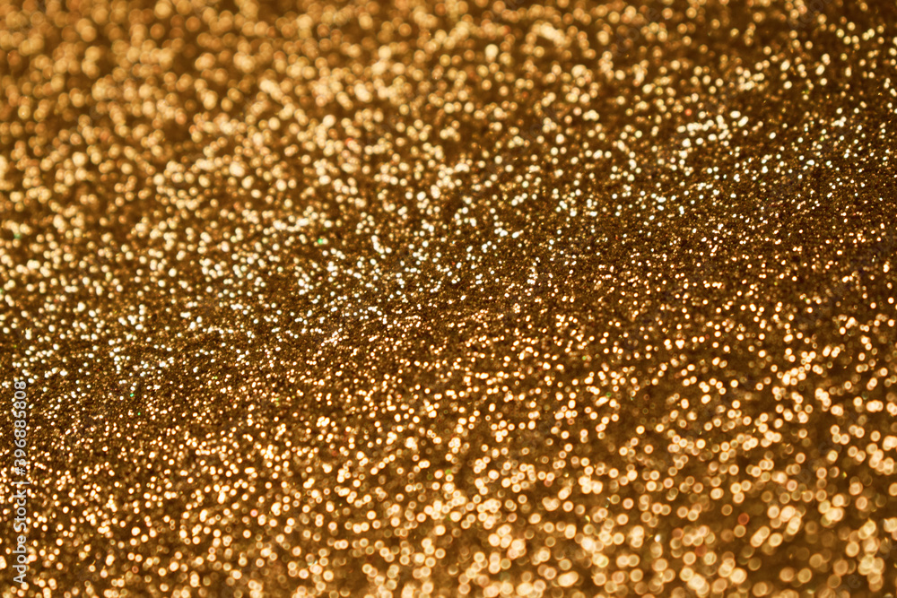 Christmas fairy lights defocused giving a blurred effect. Trendy color.Glowing and festive gold light circles created from in camera and lens bokeh. Background for design.