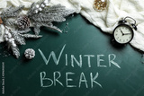Flat lay composition of Christmas decorations, knitted plaid and alarm clock on school blackboard with phrase Winter Break