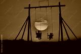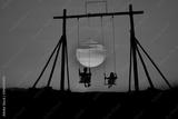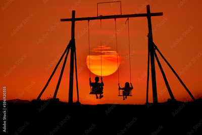 Silhouette young Children sister and brother funny enjoy to play wooden swing on sand beach with beautiful sunset sky background.