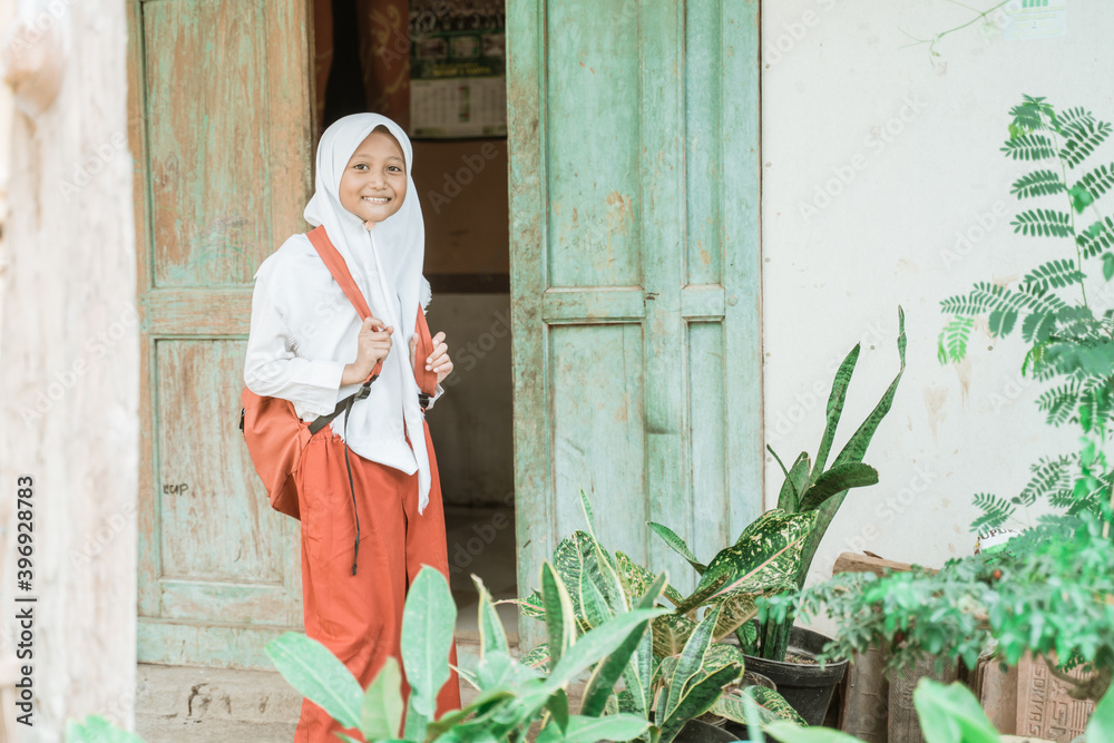 happy indonesian student getting ready to school in the morning standing in front of her house