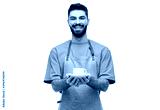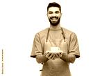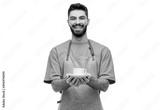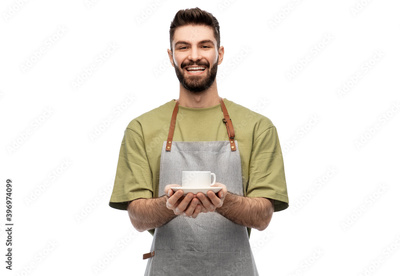people, profession and job concept - happy smiling waiter or barista in apron holding cup of coffee over white background