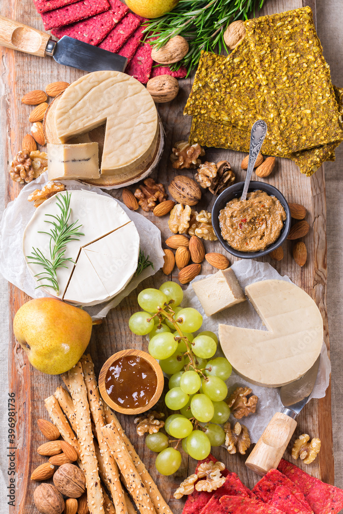 Plate of organic raw vegan cheese, snacks, nuts, fruits