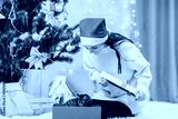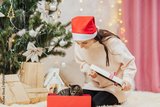 Smiling girl in Santa Claus hat sitting on the plaid near Christmas tree and opening gift box with kitten. Christmas surprise.