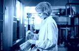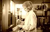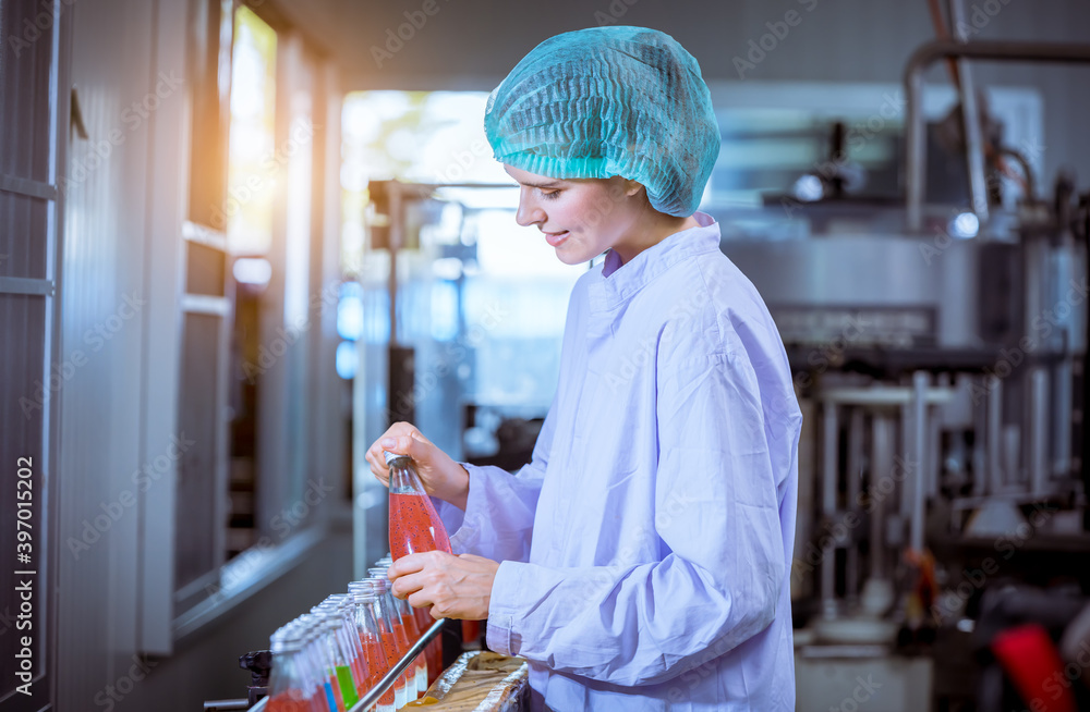 Worker of science in bottle beverage factory wearing safety hat happy show working to check quality of Basil seed produce on conveyer belt before distribution to market business