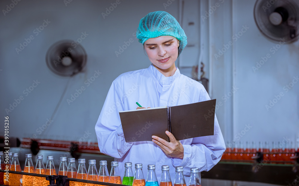 Worker of science in bottle beverage factory wearing safety hat happy show working to check quality of Basil seed produce on conveyer belt before distribution to market business