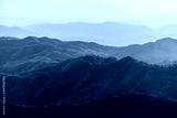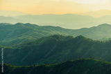 beautiful huge green mountain range shillouete in sunset time with fog