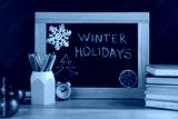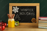 Chalkboard with text Winter Holidays, Christmas decor and school supplies on wooden table