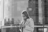 Young woman in the medical mask using smart phone in the city. COVID-19 Pandemic.