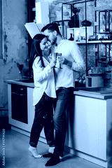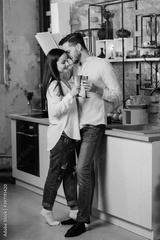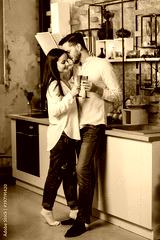 Cheerful young family couple in stylish outfit drinks champagne and hugs, showing love in kitchen.