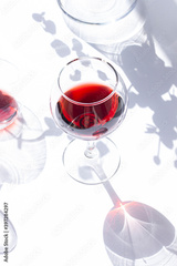 A glass of red wine on the white table with leaves shadows modern composition. Close up