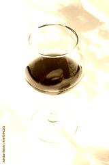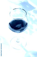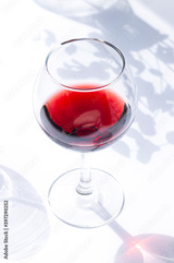 A glass of red wine on the white table with leaves shadows modern composition. Close up