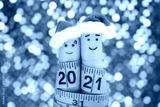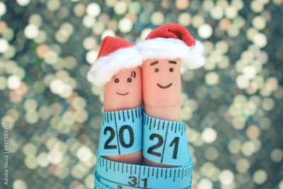 Fingers art of couple celebrates Christmas. Concept of man and woman laughing in New Year hats. Measuring tape is written 2021.