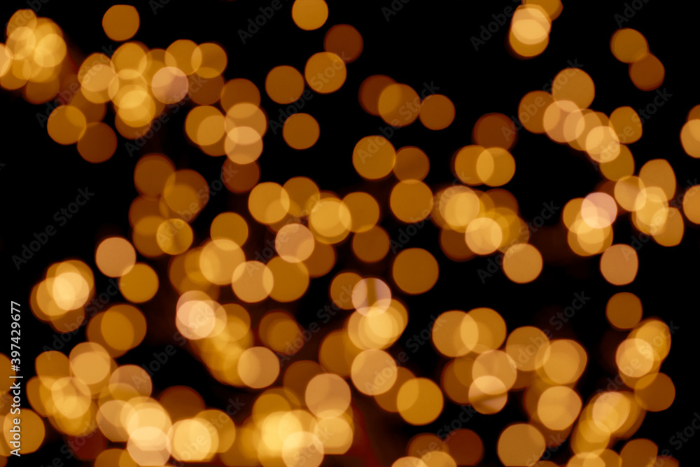 Black background of defocused color light circles beautiful bokeh lights, texture effect. Christmas and New Year holidays template