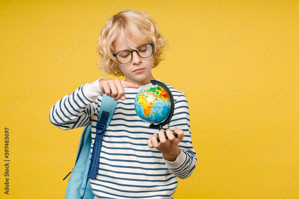 Little male kid teen boy 10s years old in striped sweatshirt eyeglasses backpack point index finger on world Earth globe isolated on yellow color background, child studio portrait. Education concept.
