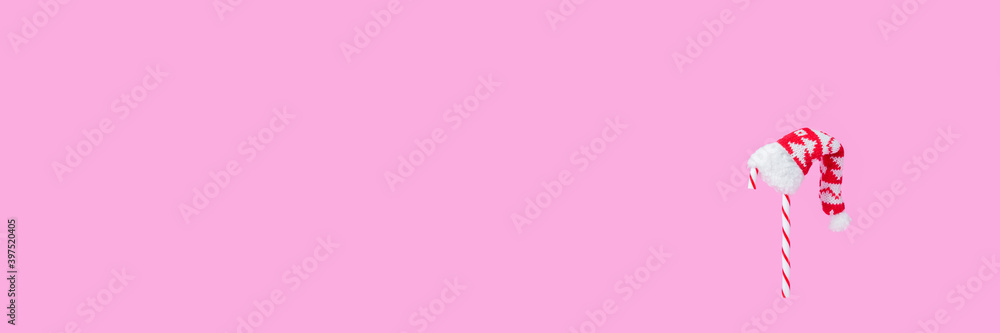 Christmas candies with Santa Claus hat on a bright pink background. Creative minimal Christmas art. Copy space.