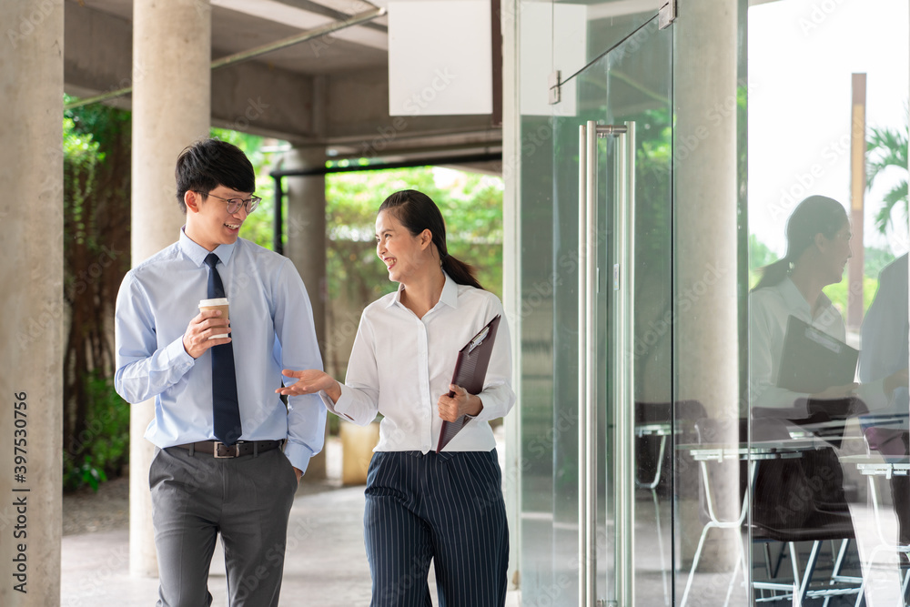 Two asian business coworkers outside office buildings discuss and commenting work to each other