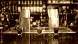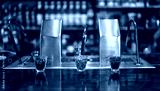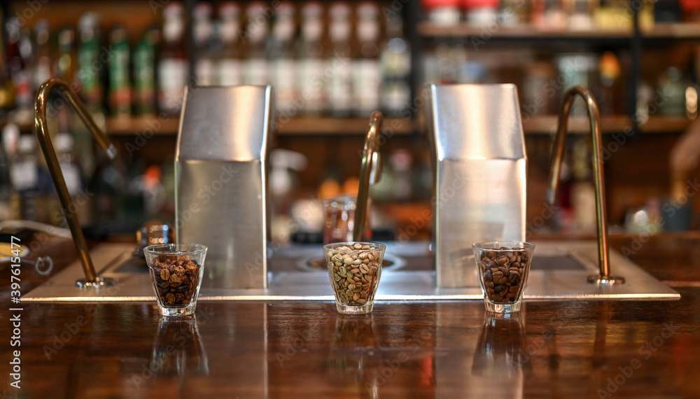 The coffee beans in the glass cup with blerred background modern coffee machine in cafe.