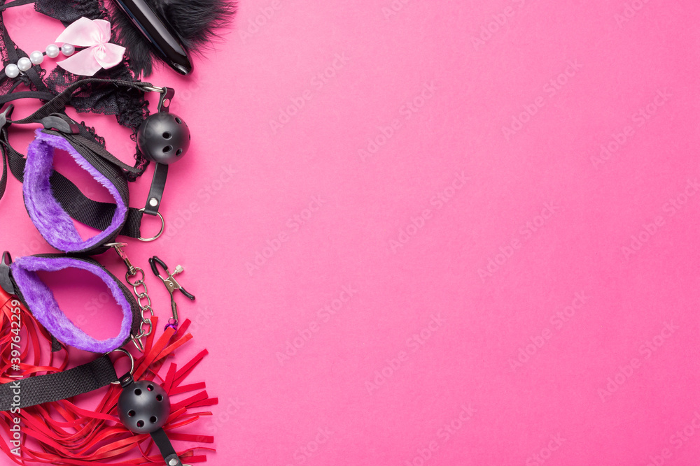 Intimate sex games. BDSM Tools dildo vibrator, gag, nipple clamps, handcuffs, whip and other on red pink background. Free space for your text