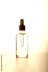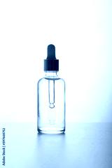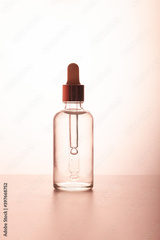 A medical dropper with liquid and a drop falling over a bottle of essence, serum or care oil in the bathroom against a palm tree. The concept of face and body skin care, aromatherapy