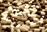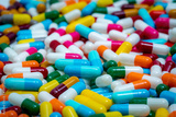 Selective focus on multi-colored antibiotic capsule pills. Antibiotic drug resistance concept. Pile of colorful capsule pills. Pharmaceutical industry. Antimicrobial drug for treatment infection.