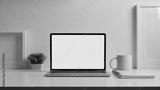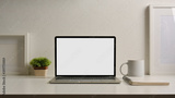 Close up view of home office desk with laptop, stationery and decorations
