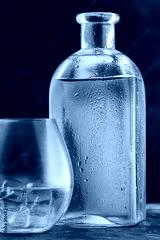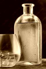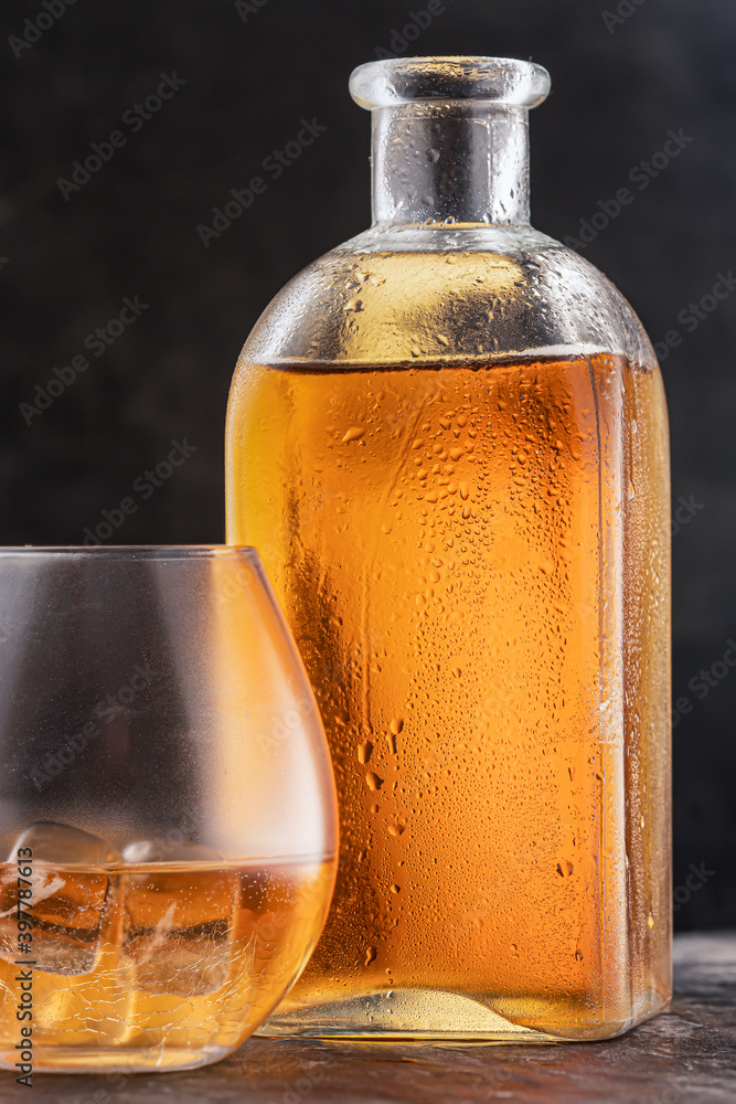 bottle and glass with whiskey or Bourbon Scotch on the table, drops on the glass dark background. vertical photo