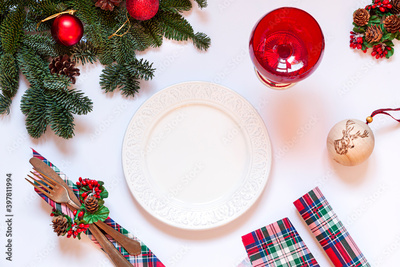 Christmas or New Year table settings with festive decorations on the white background. Top view