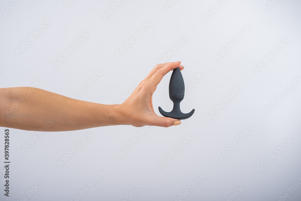 Faceless woman holding a black anal plug on a white background. Assortment of sex shop
