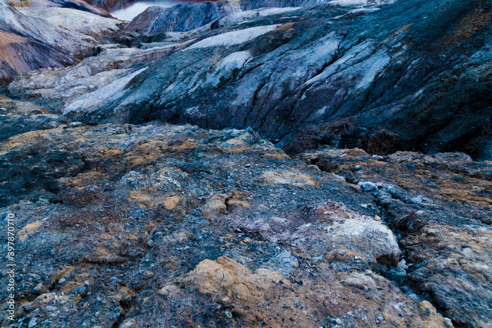 Unusually beautiful autumn landscape of red lakes, colorful slopes and forest. Ural Mars. Grey clouds moving in the overcast sky.