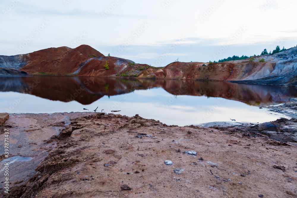 Ural Apocalyptic Surreal unusual landscape, similar to the surface of the planet Mars. Frozen red-brown surface of Chernozem.