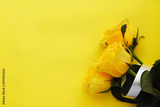Three yellow beautiful roses on a yellow background. Copy spase. Concept for Mother's Day, Family Day, Valentine's Day