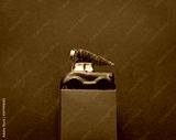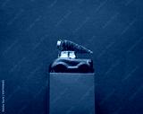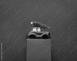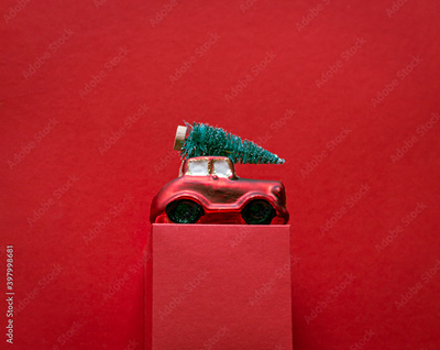 Red Christmas or New Year greeting card with a festive car toy. Winter holiday concept composition.