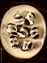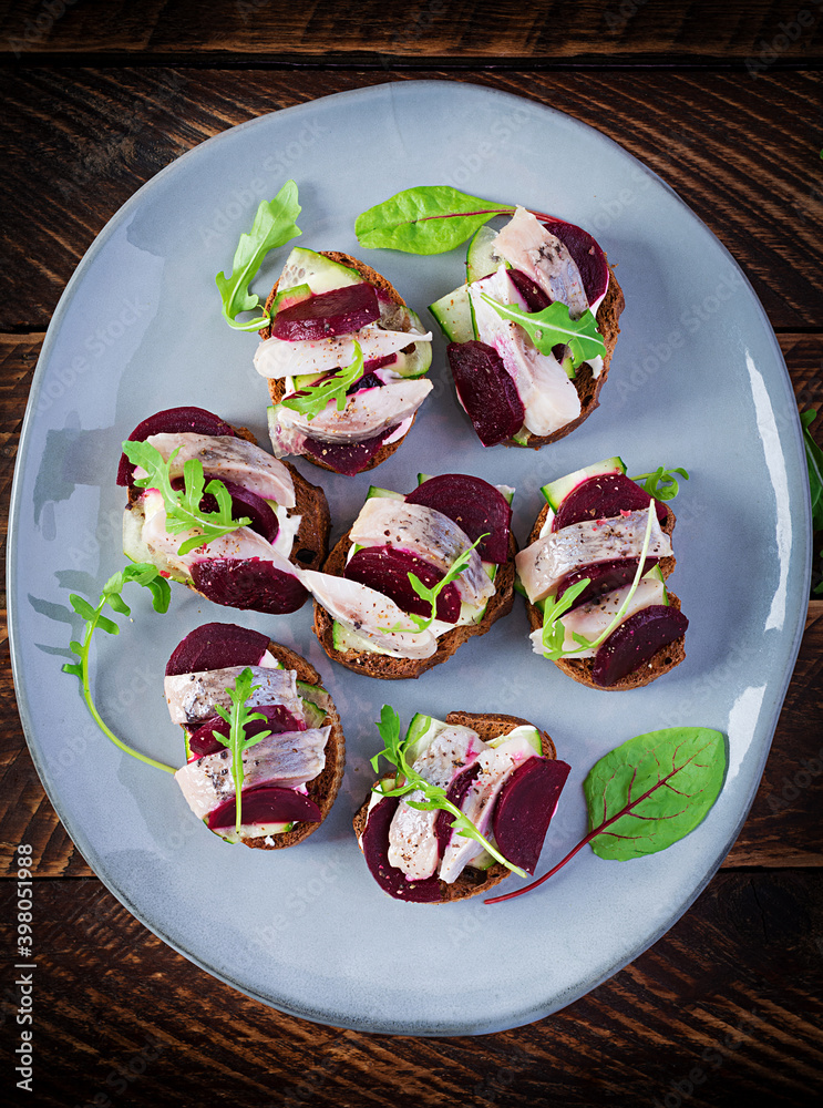 Herring fillet. Sandwich with salted herring and slice beetroot on the toasts on wooden table. Scandinavian cuisine. Top view, overhead