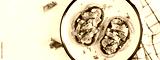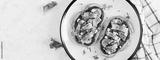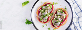 Herring fillet. Sandwich with salted herring and beetroot pate on the toasts on white plate. Scandinavian cuisine. Top view, banner