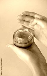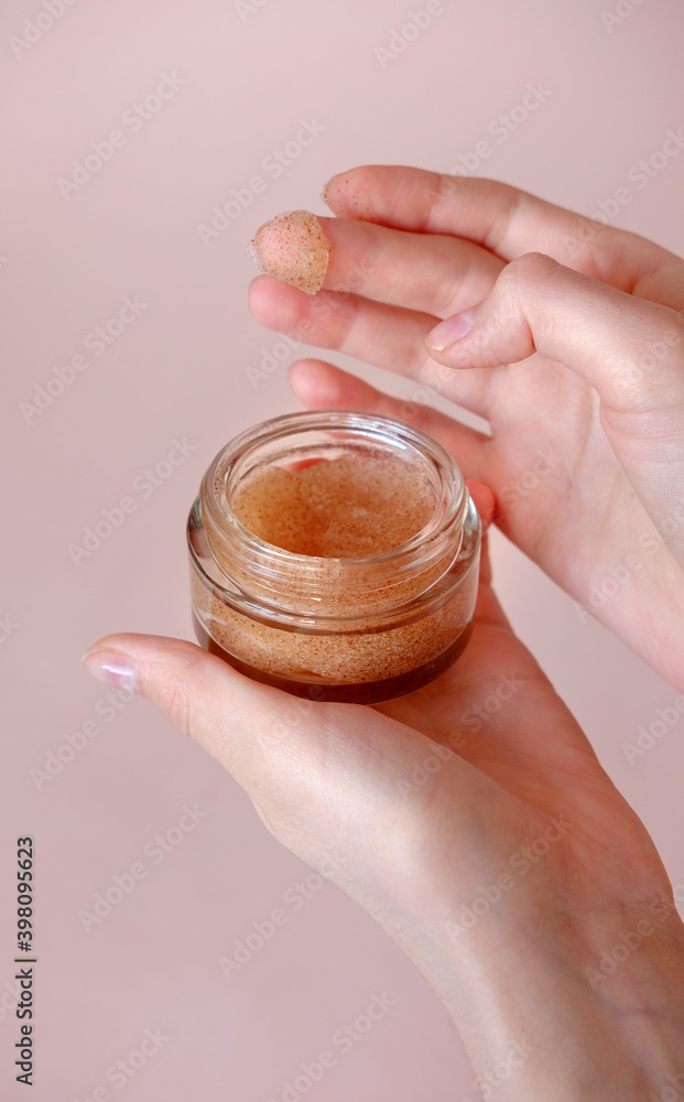 Young woman uses a scrub for skin care. Self-care, relaxation