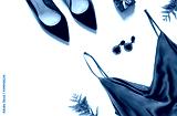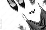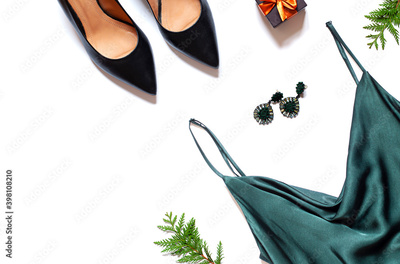 Christmas or New Year fashion party concept frame with clothes and accessories. Preparation for winter holiday events on the white background. Festive shopping composition top view. Copy space