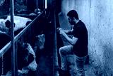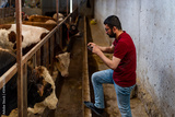 Smart Agritech livestock farming. Young farmer using a smart phone and statistics wireless on a smart phone app in a modern barn. Reading a dairy cows data ear tag