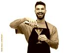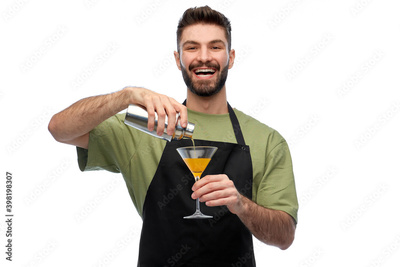 alcohol drinks, people and job concept - happy smiling barman in black apron with shaker and glass preparing martini cocktail over white background